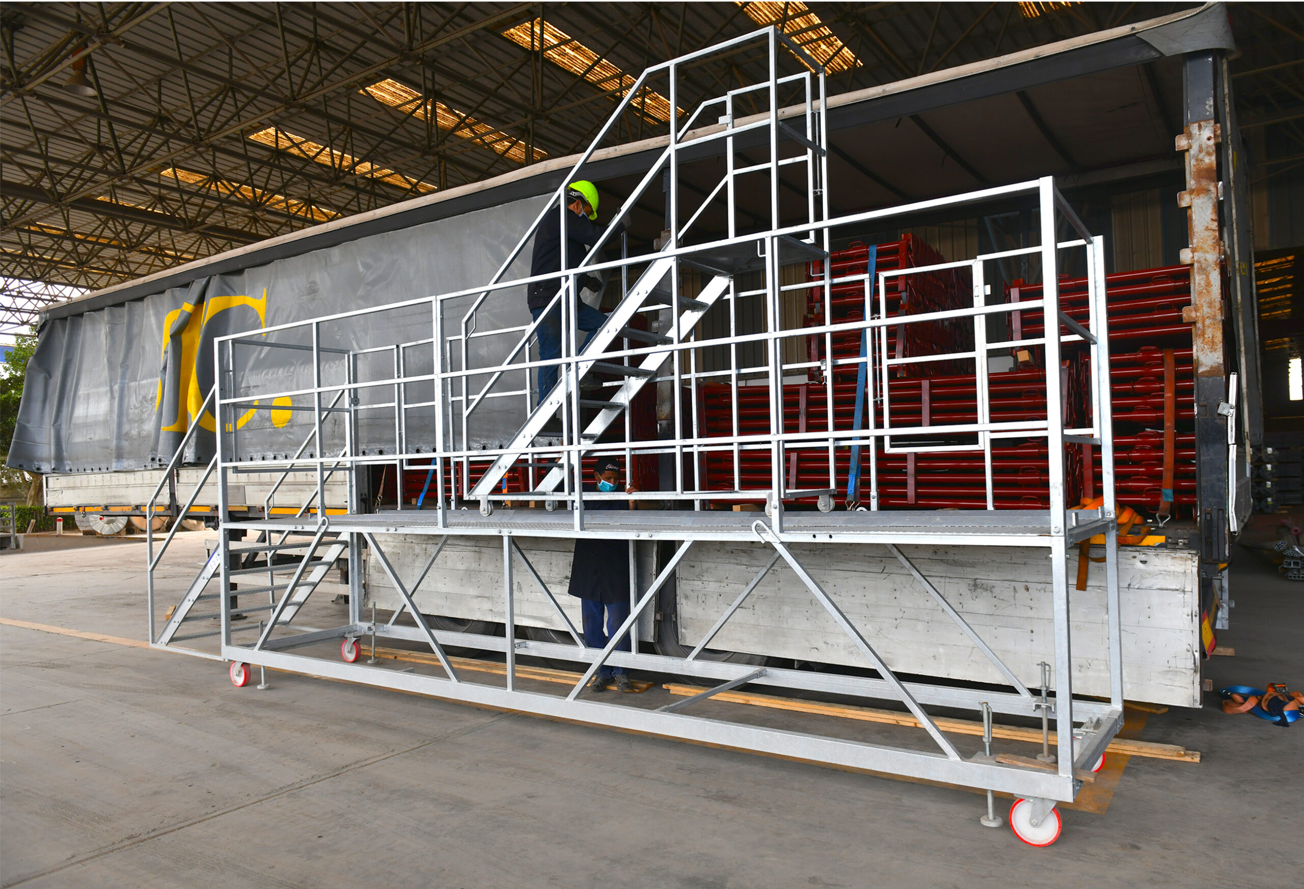 Plateforme mobile spécialement conçue pour servir de quai de déchargement, idéal lors d’utilisations ponctuelles. Elle facilite l’accès et la manutention lors du chargement et du déchargement des camions.